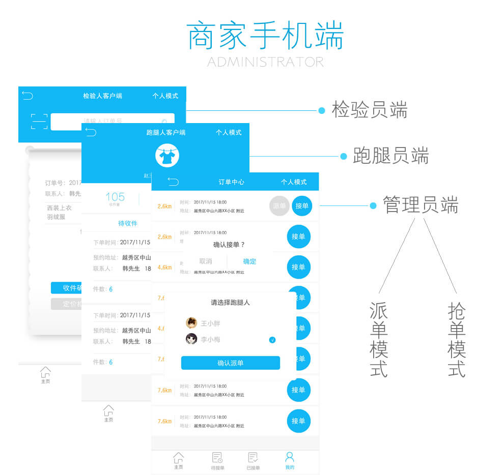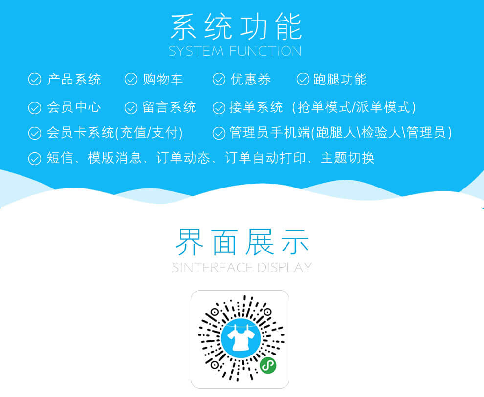 在线下单、商家接单(抢单、接单)、上门取衣、检衣洗衣、上门送衣、优惠卷、跑腿功能、会员卡系统(充值、支付)、留言系统、管理员手机端(跑腿人、检验人、管理员)、短信、模版消息、订单动态、订单自动打印、主题切换